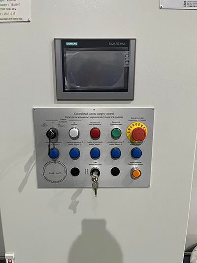Система подачи амина состоит из пневматического мембранного насоса, датчика уровня жидкости и трубопроводной арматуры. Трубопроводная арматура включает в себя пневматический шаровой клапан, преобразователь расхода, фильтр, U-образную трубную арматуру.