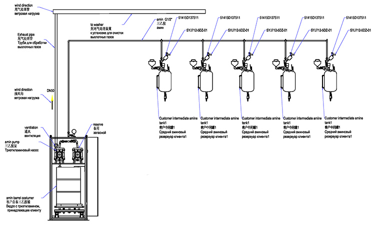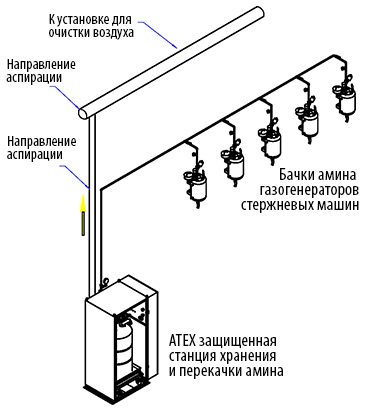 В системе должны обеспечены соединения для подключения стандартных бочек 1А1. Жидкий амин из 200л бочек перекачивается в 300л резервуар для хранения при помощи взрывобезопасного насоса. Затем подача осуществляется в автоматическом режиме в локальные газогенераторы стержневых автоматов без остановки работы самих стержневых автоматов.